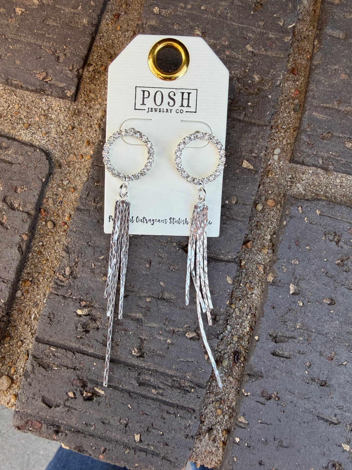 These silver earrings are fun and flirty. Clear crystal hoop with a fun dainty silver tassel drop.