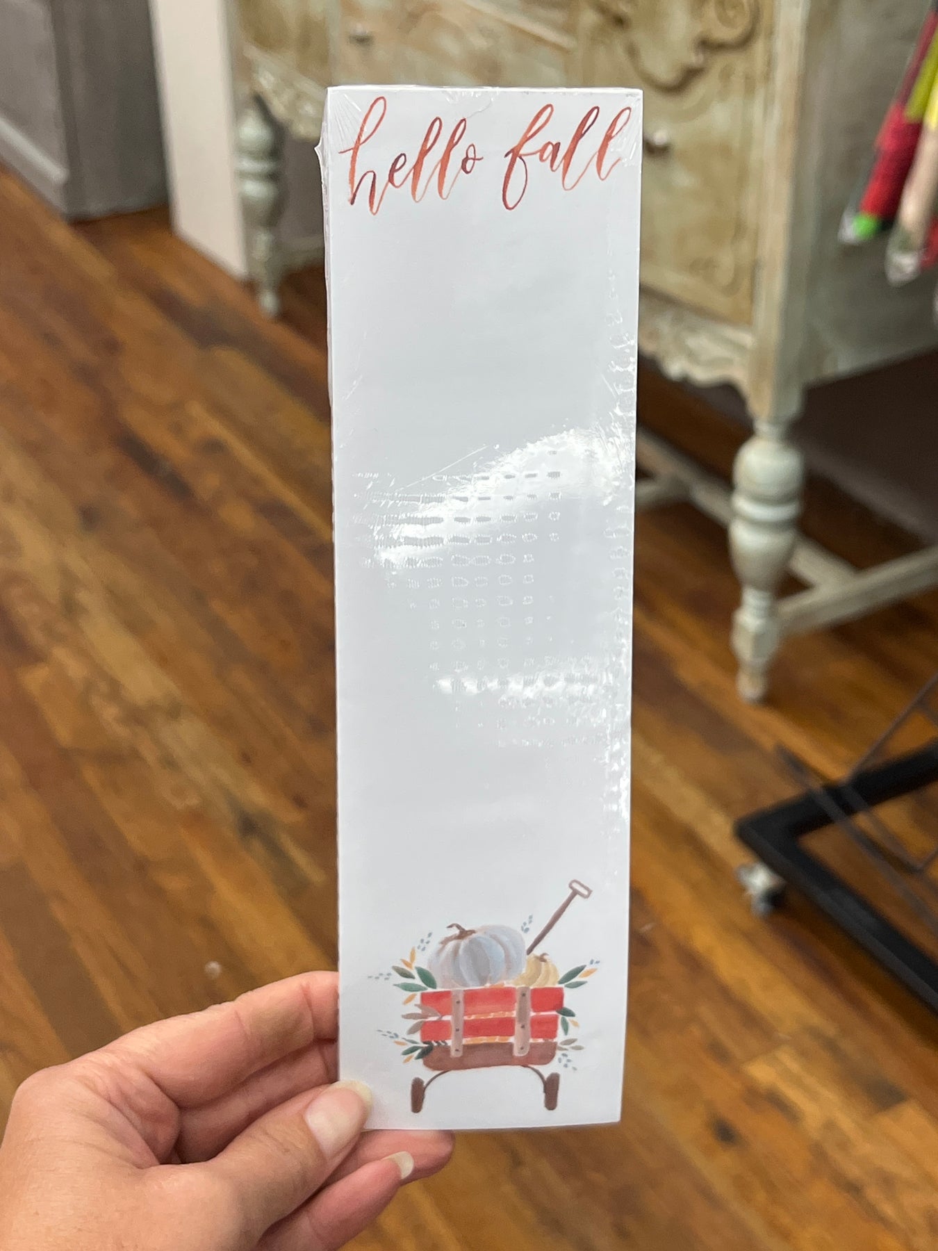 A rustic-inspired magnetic list notepad for Fall. Complements well with coordinating design pieces for a festive collection. Includes 60 pages. Made in USA.