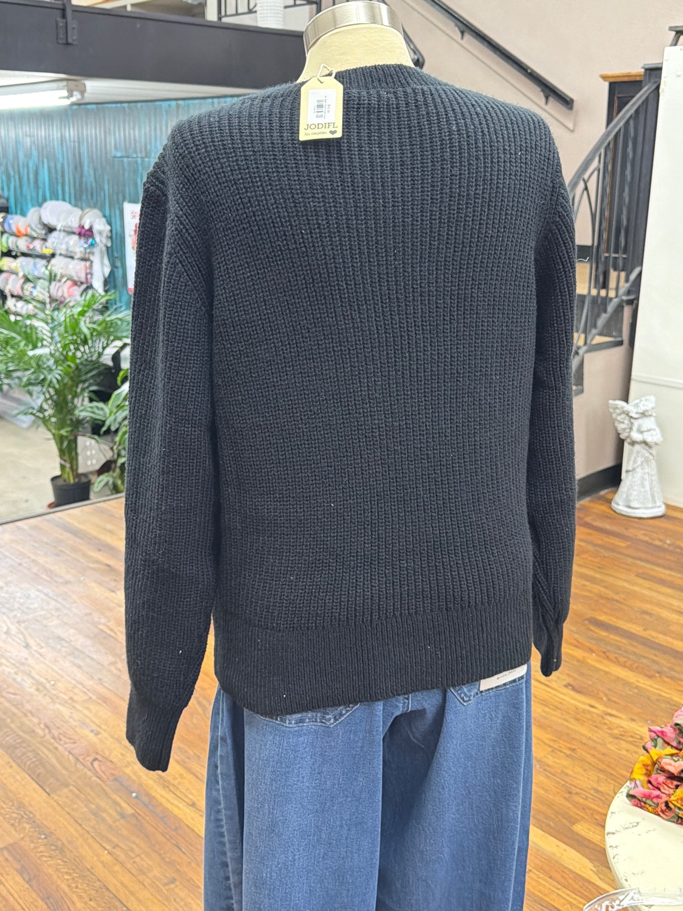 Brighten your wardrobe with the Black Flower Eyelet Sweater, where cozy meets charm. Featuring delicate eyelet detailing, this playful sweater adds a touch of whimsy to your everyday look while keeping you comfortably warm. Perfect for layering or wearing solo, it's a fun way to bloom in style no matter the season.