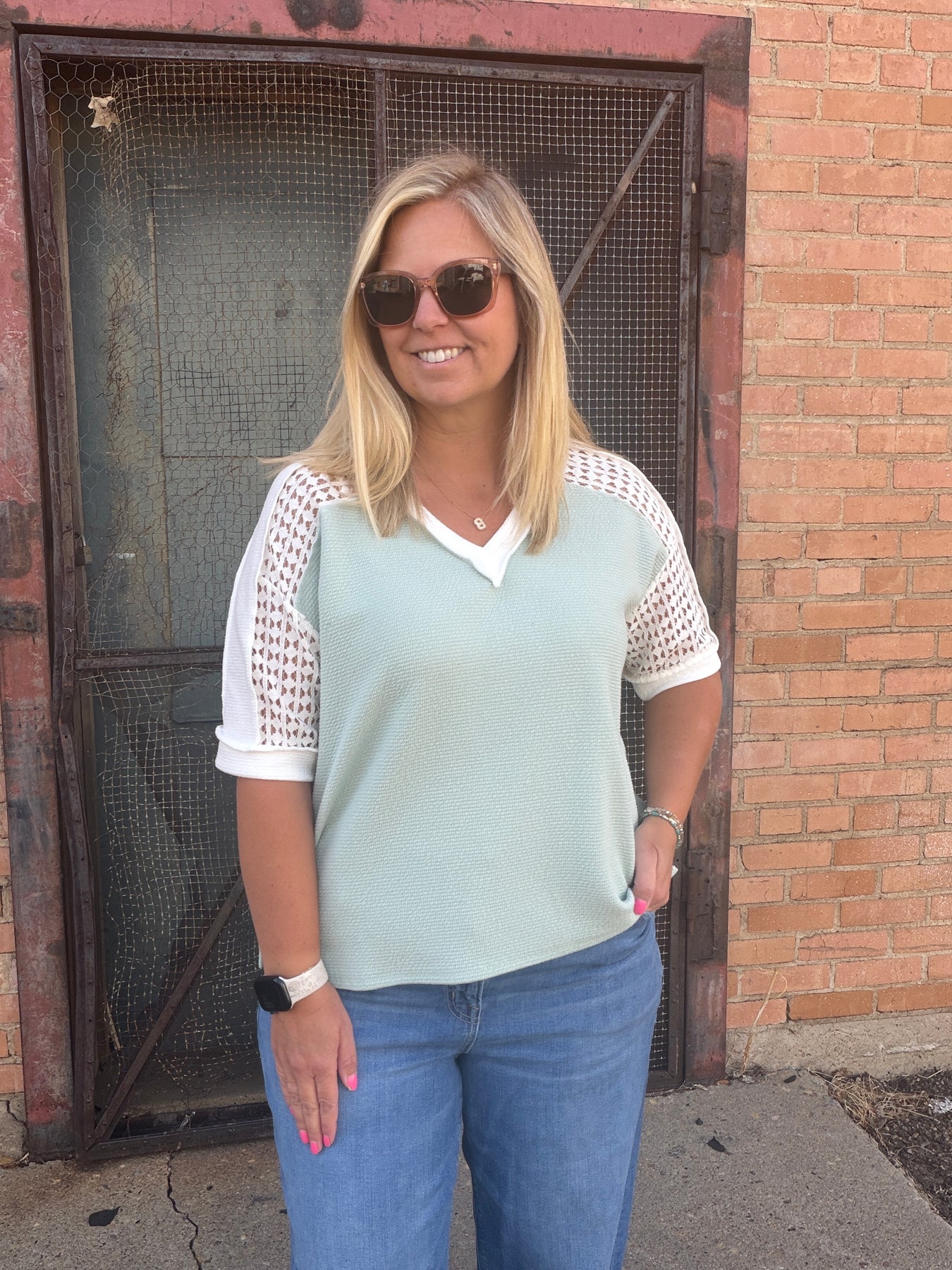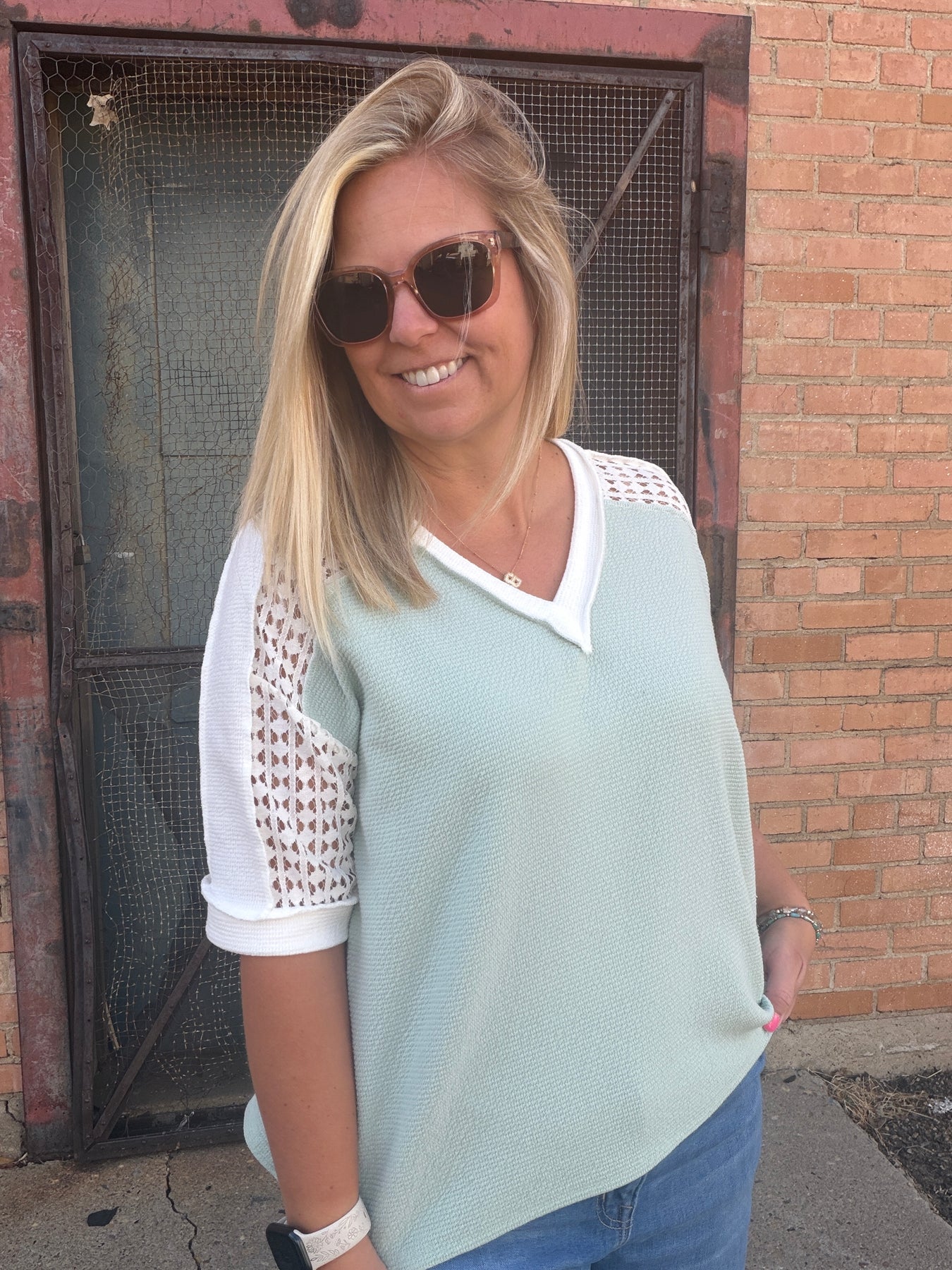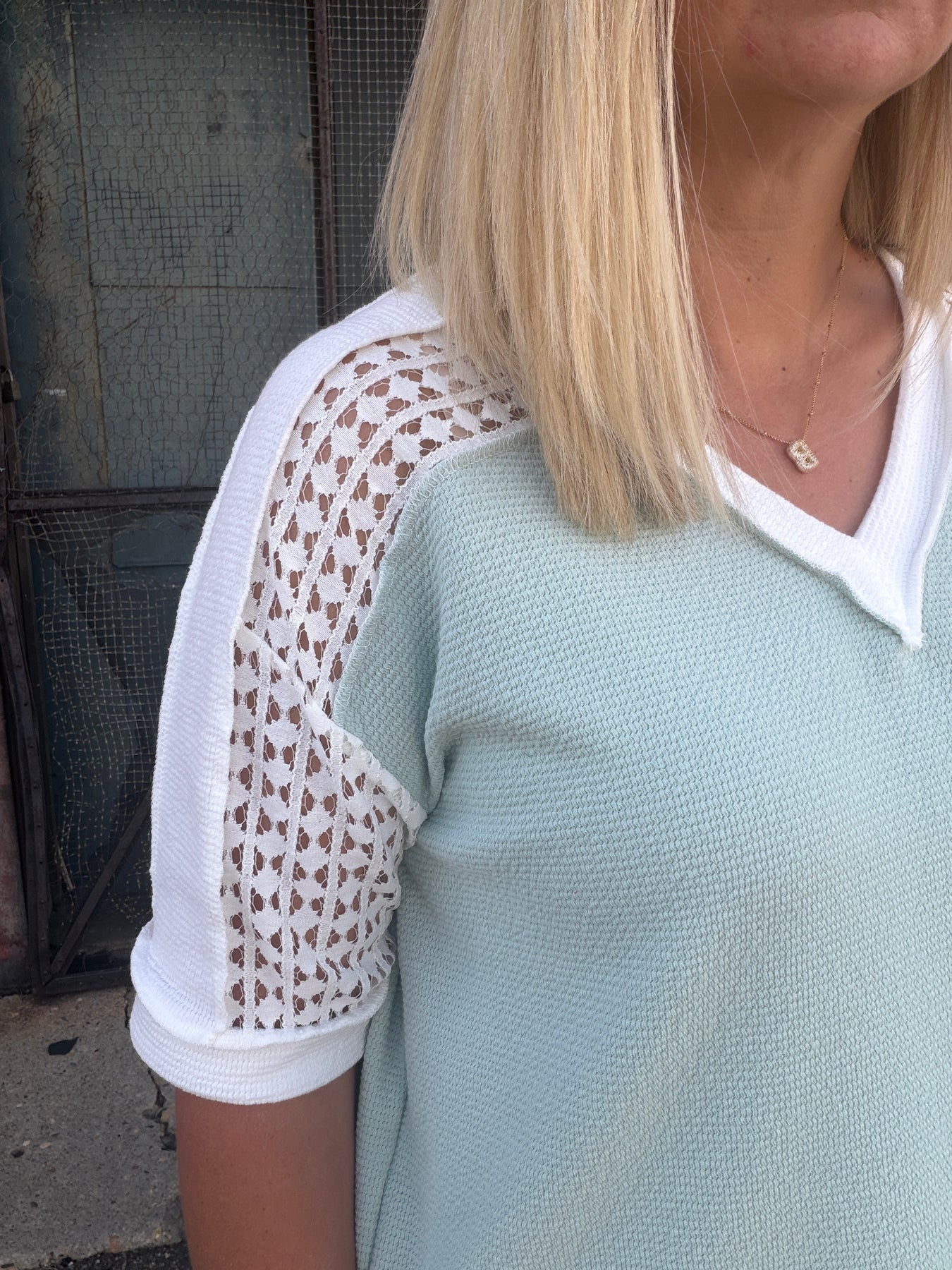 Embrace effortless summer style with this charming sage-colored top. Crafted from soft white cotton, delicate lace sleeves add a touch of elegance while keeping you cool and comfortable. The short sleeve design is perfect for warm weather, offering a versatile piece that transitions seamlessly from casual days to relaxed evenings. A timeless staple for any seasonal wardrobe.